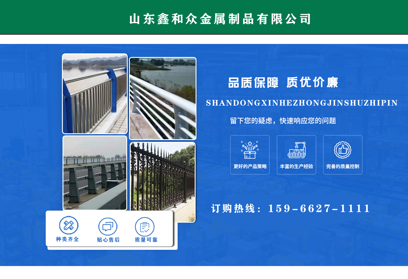 山東鑫和眾金屬制品有限公司主要產(chǎn)品有防撞護欄,橋梁護欄,道路護欄,河道護欄,不銹鋼護欄等護欄。提供設(shè)計方案,一站式定制,包您滿意價格優(yōu)惠,歡迎來電咨詢!    公司常年從事銷售護欄防撞護欄,橋梁護欄,道路護欄,河道護欄,不銹鋼護欄,橋梁鋼護欄,河道燈光護欄等。產(chǎn)品廣泛應(yīng)用于橋梁、河道、旅游景區(qū)、道路、公路、公園、小區(qū)、景觀、道路防撞等領(lǐng)域。    公司產(chǎn)品均采用優(yōu)質(zhì)不銹鋼材料,符合相關(guān)標(biāo)準(zhǔn)。各種型號不銹鋼復(fù)合管及護欄,質(zhì)量嚴(yán)格把控。產(chǎn)品強度高、耐腐蝕、焊接牢固、抗沖擊、性能好,防撞護欄結(jié)構(gòu)簡單、美觀實用大方。     歡迎前來訂購!...